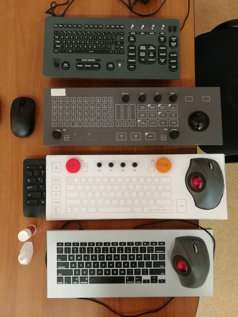 Если панель предполагает типовую клавиатуру или трекбол — в картонной основе можно сделать дырки под нее и вставить «заподлицо». Это рабочая модель — сочетать доступные средства для быстрой оценки компоновочных решений «вживую». В своё время я взял пенопластовый блок от упаковки и использовал его базу, натыкав в него реальный судовой трекбол, отпечатанные на принтере кнопки, небольшие ручки от радарной клавиатуры предыдущего поколения и молочные крышки как аналог крупных ручек (см. фото в начале статьи, правда там пенопласт то ли ещё не поставлен, то ли уже снят, но, как говорил, другой не сохранилось).